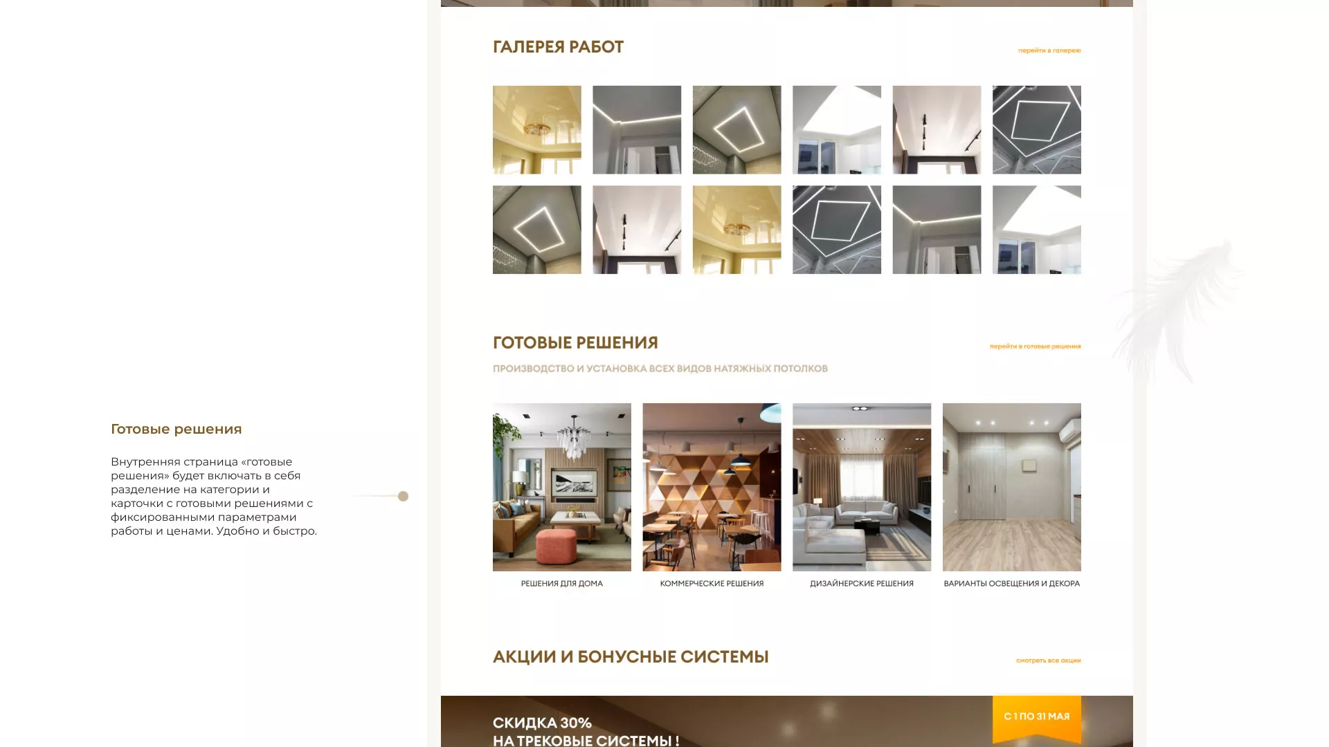 Что мы сделали. Разработали сайт в теплых и уютных «шоколадных» тонах. Продумали структуру, наполнили ее удобными разделами такими как «готовые решения», которые включают в себя не только уже готовые варианты с фиксированной ценой, но и разделение по категориям: решения для дома, коммерческих помещений, интересные дизайнерские решения. Так же предложили клиенту онлайн-калькулятор, что может существенно упростить потенциальным заказчикам нашего клиента в Новокубанске заказ потолков.
