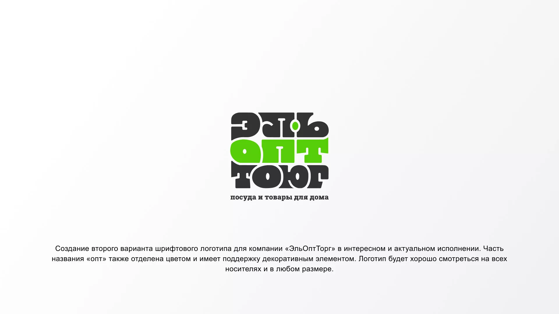 Создание второго варианта шрифтового логотипа в Новокубанске для компании «ЭльОптТорг» в интересном и актуальном исполнении. Часть названия «опт» также отделена цветом и имеет поддержку декоративным элементом. Логотип будет хорошо смотреться на всех носителях и в любом размере.